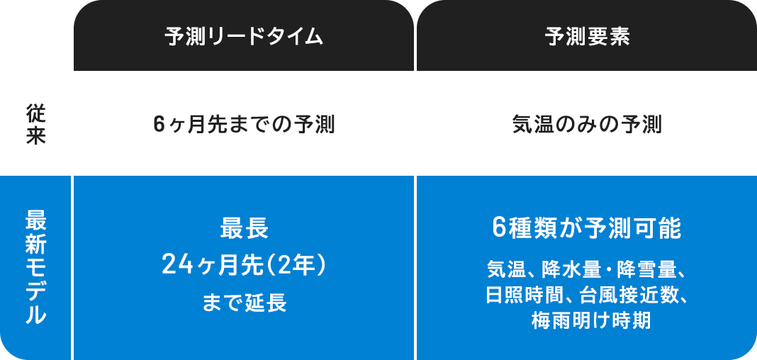 精度検証の結果、極端な高温や低温が予測しにくかった従来の手法と比較して、6か月前時点の予測誤差は最大40%改善しました。