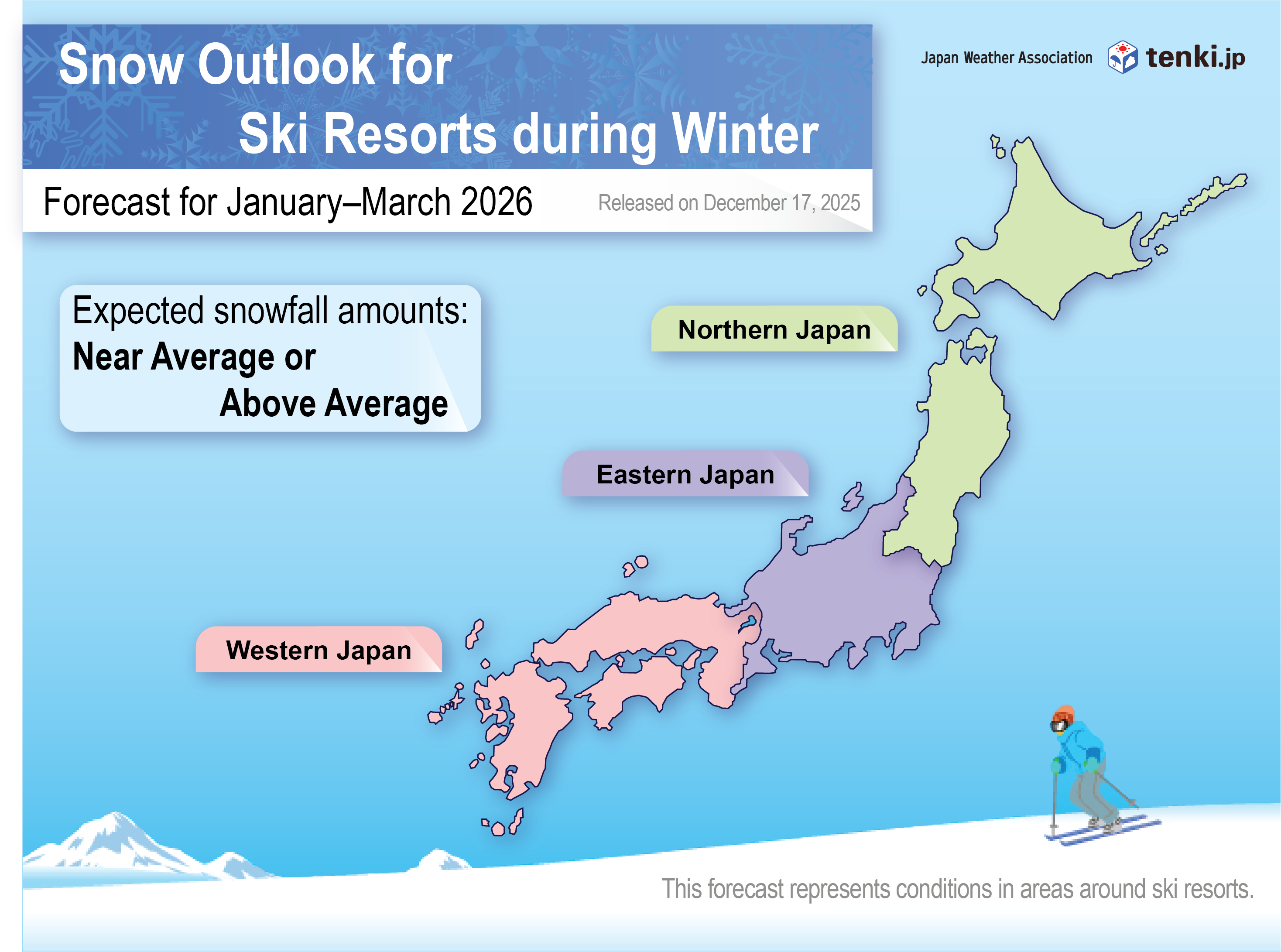 Temperatures in January and February 2026 are expected to be near average in northern and eastern Japan, and near average or slightly below average in western Japan. Snowfall amounts on the Sea of Japan side are expected to be near or above average.