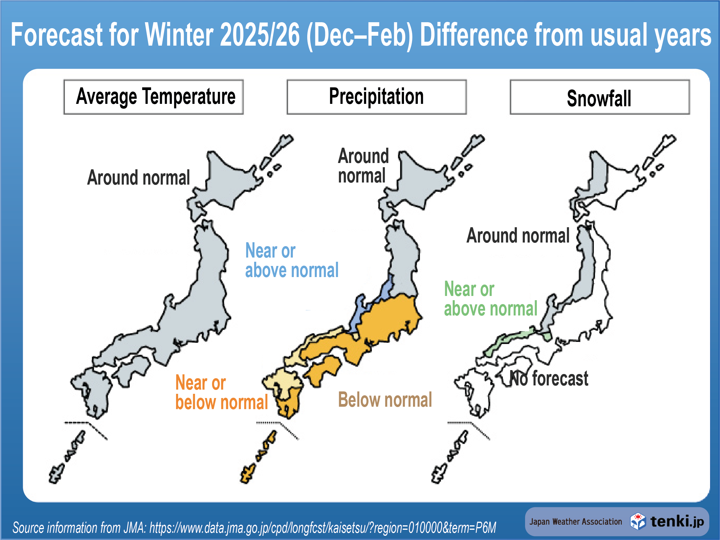 According to the Cold-Season Outlook released by Japan Meteorological Agency’s (issued September 22, 2025, for December 2025–February 2026), winter temperatures are expected to be around normal.