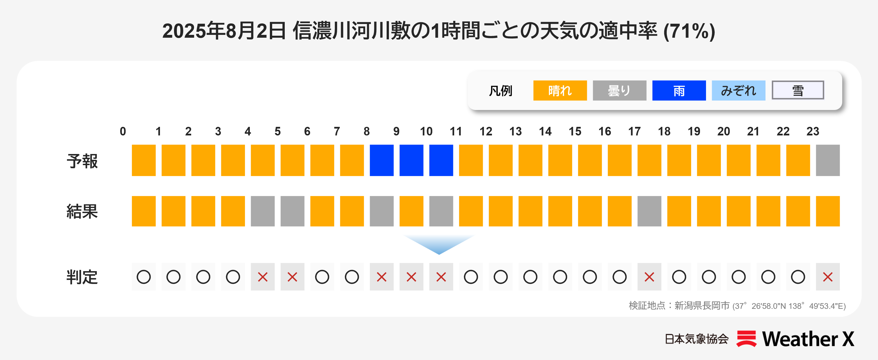 「長岡まつり大花火大会」の開催された8月2日の天気予報(前日17時発表)の適中率を検証しました。(検証地点:信濃川河川敷)