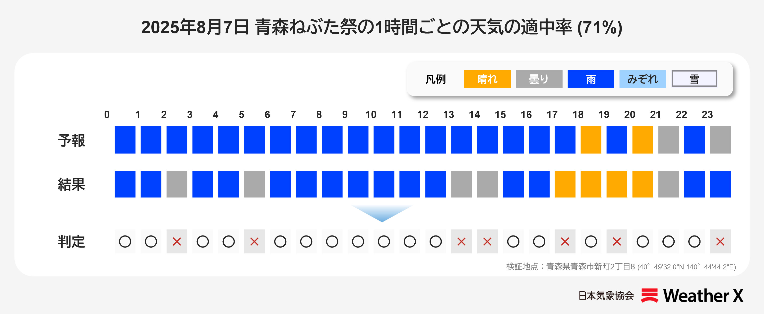 祭りの最終日で海上運行の行われた8月7日の天気予報(前日17時発表)の適中率を検証しました。(検証地点:ねぶた運行開始地点である本町一丁目交差点)