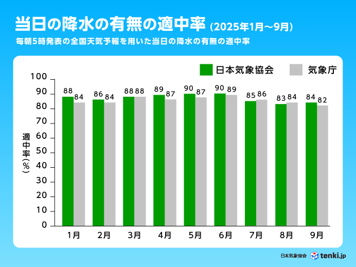 「当日の降水の有無の適中率」の検証結果(2025年1月~9月)