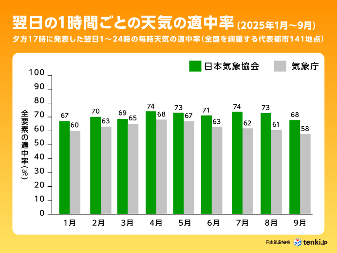 「当日の降水の有無の適中率」では日本気象協会は気象庁と同等程度、「翌日における1時間ごとの天気予報の適中率」では気象庁の精度を上回りました。