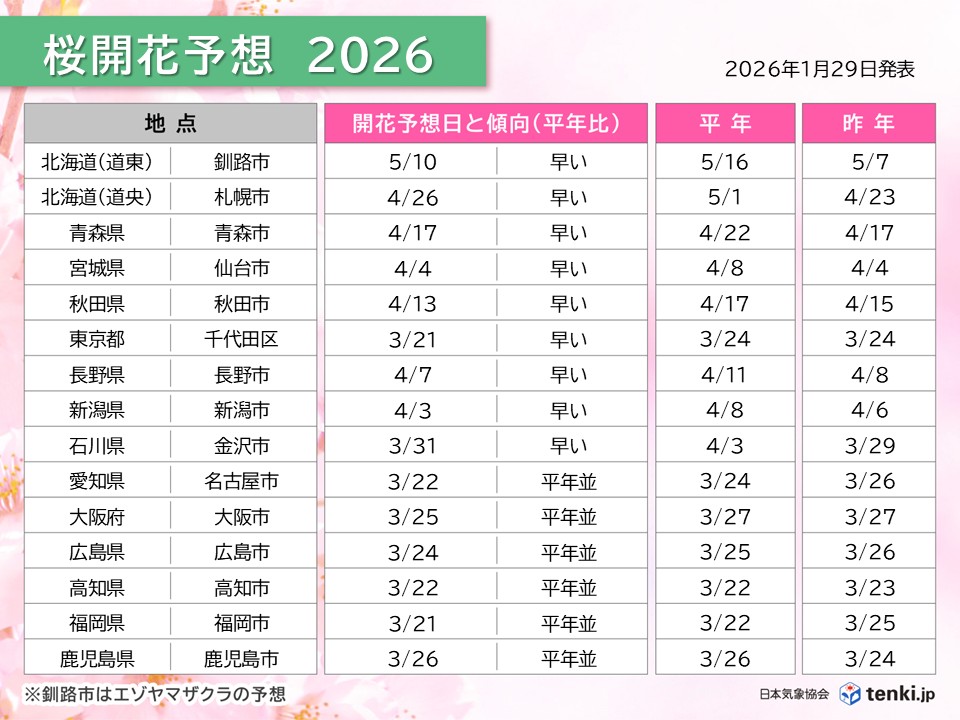一般財団法人 日本気象協会(本社:東京都豊島区、理事長:渡邊 一洋、以下「日本気象協会」)は、日本全国53地点の桜の開花予想(第1回)を、2026年1月29日(木)に発表しました。