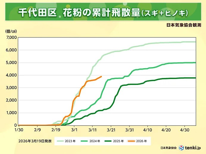 図は、東京都千代田区(日本気象協会観測)で1cm2に観測された花粉の数を累計したグラフです。今年(オレンジ色)と過去3年(2025年、2024年、2023年)を示しています。