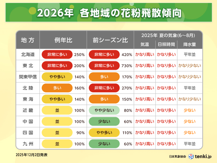 一般財団法人 日本気象協会(本社:東京都豊島区、理事長:渡邊 一洋)は、2026年春の花粉飛散予測(第2報)を2025年12月2日(火)に発表しました。