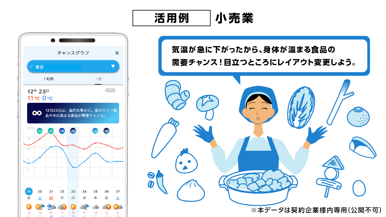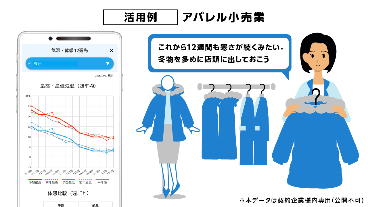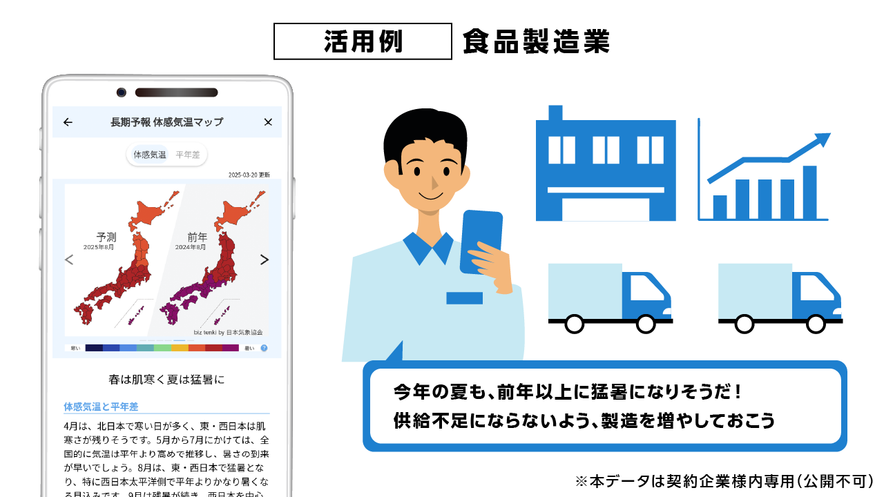 biz tenkiは、食品製造・アパレル・小売・飲食・農業など、天候の影響を受けやすい業種の業務判断を支援します。