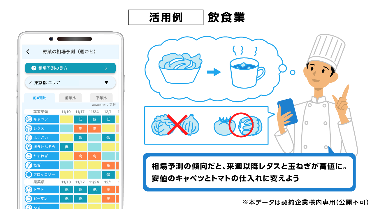 - 野菜の相場予測を確認し、メニュー計画を調整。