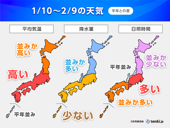 度々流れ込む寒気や低気圧の通過によって、日本海側で平年に比べて雪や雨の降る日が多くなりますが、東・西日本の太平洋側を中心に比較的晴れる日が多い予想です。