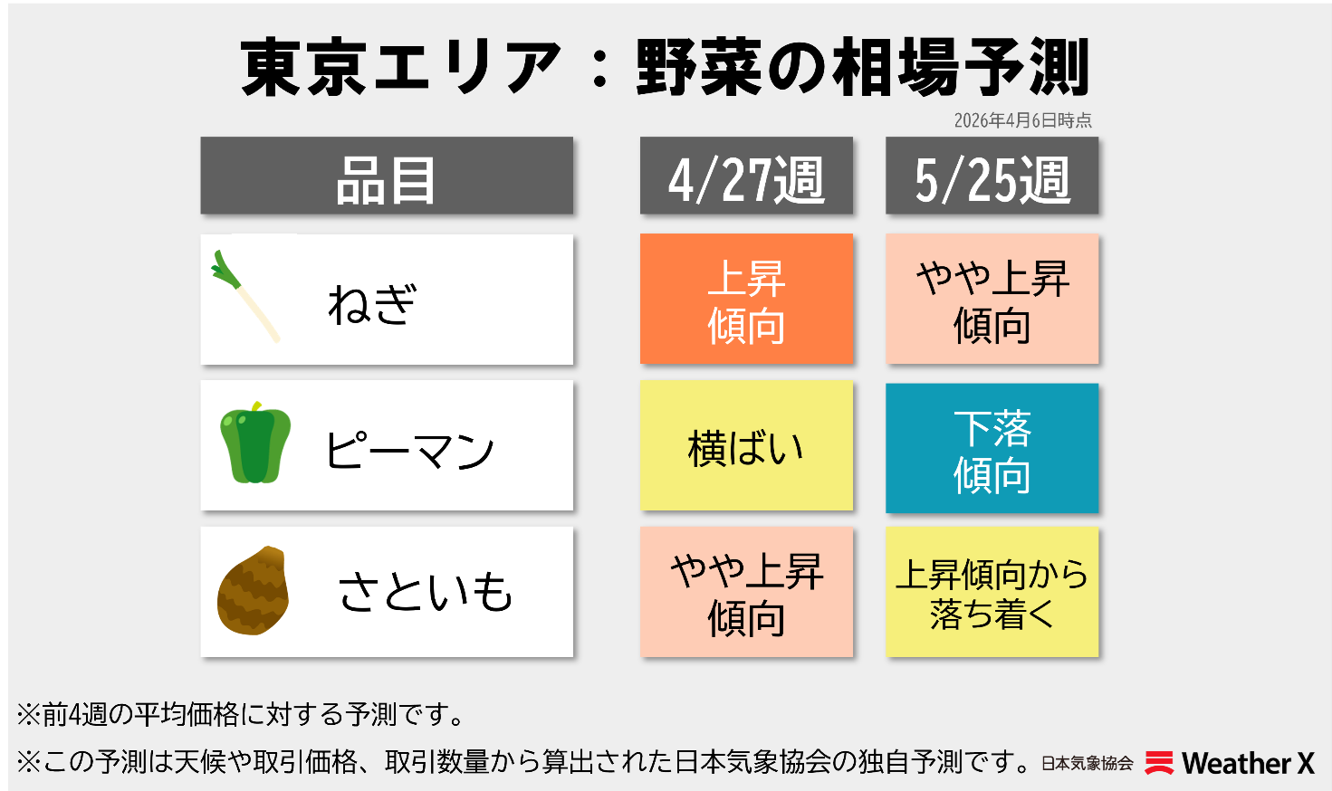 本記事では日本気象協会の「野菜の相場予測」(4月6日時点、東京エリア)をもとに、4週先(直近判断)・8週先(計画判断)で何が起きるのかを整理し、仕入れ・製造・販売計画の判断にどう落とし込めるのかを業界別に整理します。