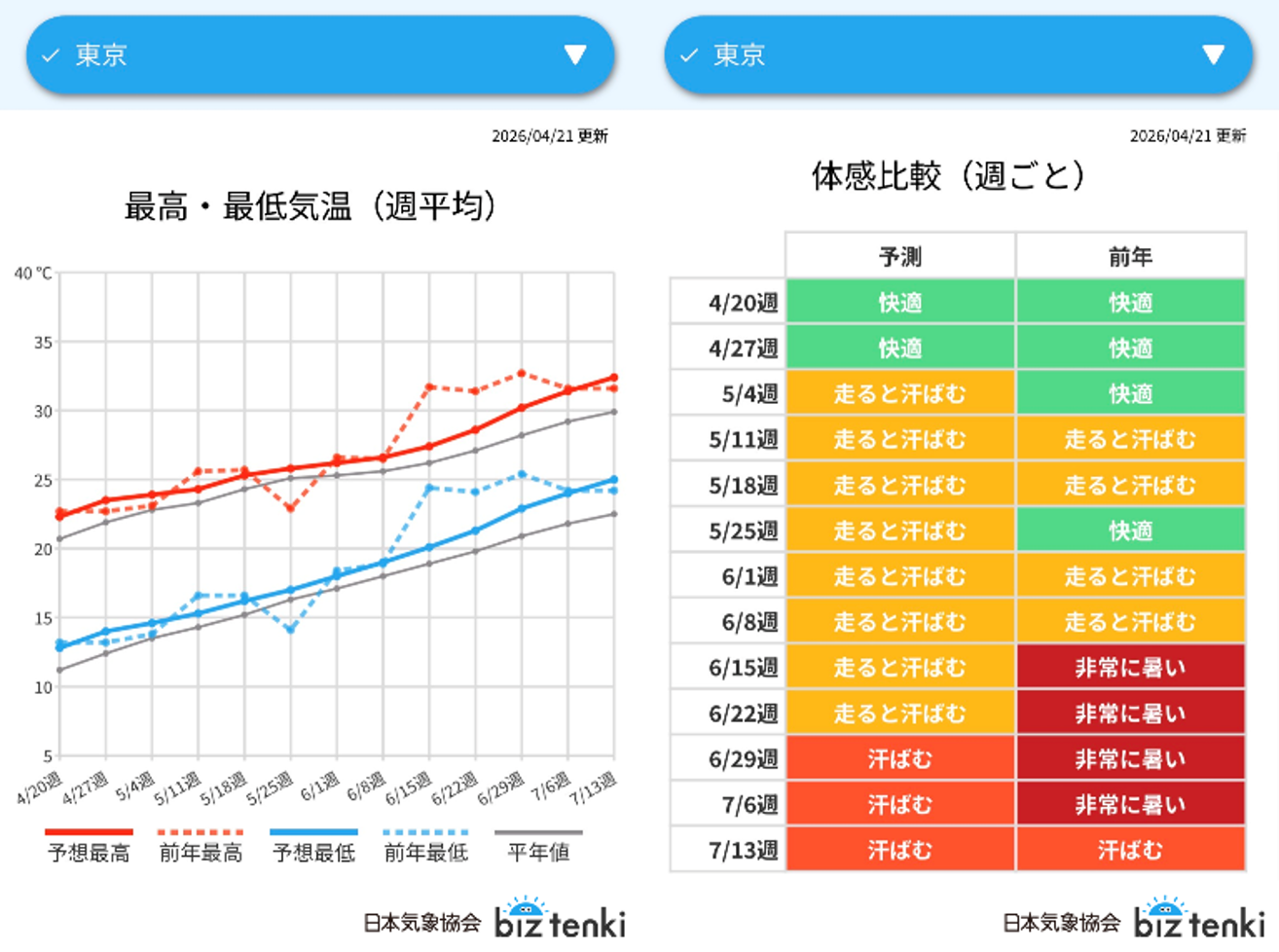 • 気温上昇と天候変化の両面を事前に把握することで、ゴールデンウィーク後の需要変動や夏物需要の増加に対し、前倒しの販促・在庫調整など柔軟な意思決定が可能になります。