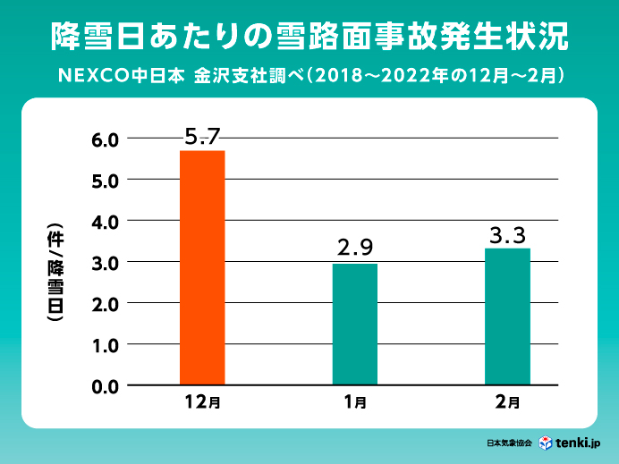 NEXCO中日本 金沢支社の調査(2018~2022年12月~2月、福井県・石川県・富山県)によると、降雪日あたりの雪路面事故件数は「12月が平均5.7件」で最多で、1月(2.9件)、2月(3.3件)を上回っています。