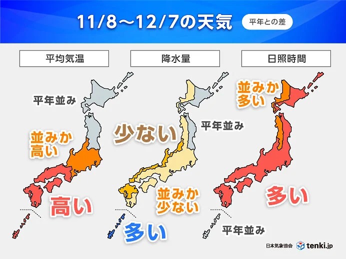 11月は全国的に前年並みの高温となる一方で、寒気の影響を受けるタイミングでは北日本を中心に厳しい冷え込みとなる時期があるでしょう。