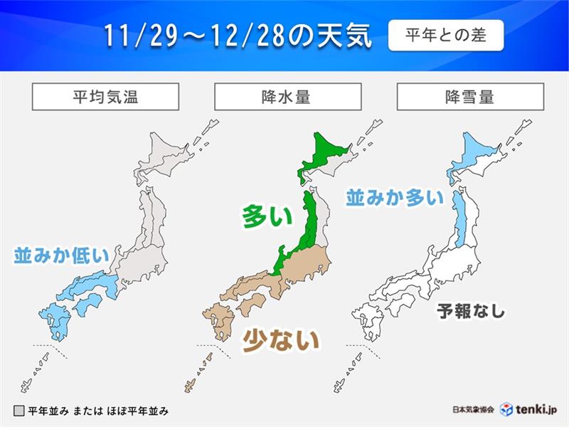 気象庁の1か月予報(11月27日発表)によると、1か月平均の海面気圧は、中国大陸からオホーツク海付近にかけて気圧が平年より低く、北・東日本の日本海側を中心に低気圧の影響を受けやすく、冬型の気圧配置が強まりやすい時期があるでしょう。