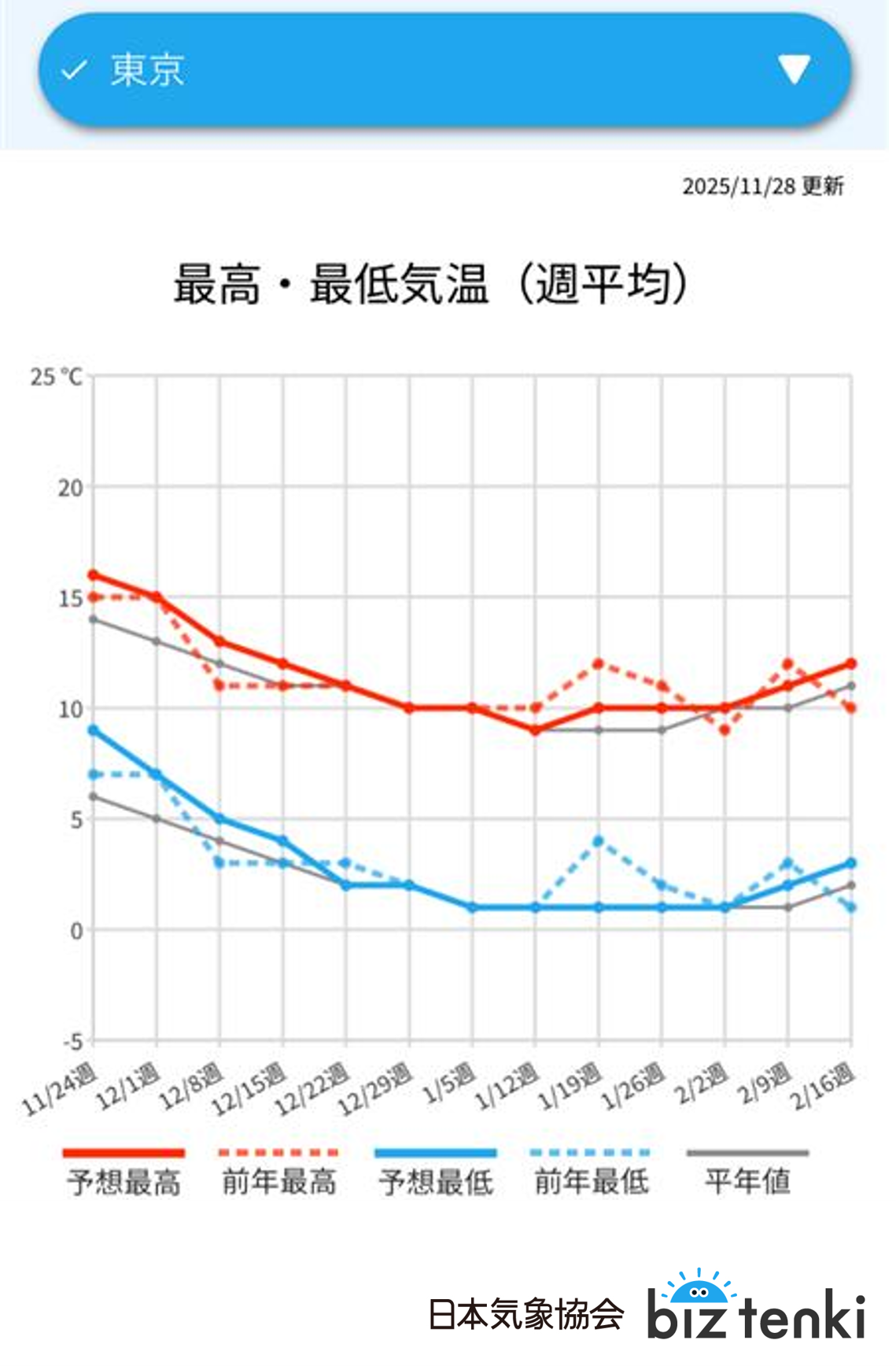 12月は上旬を中心に全国的な気温低下が見込まれ、冬物商材の需要が短期間で大きく動きやすくなります。急な寒さに備え、長期予報を活用して需要の変動を事前に把握することが重要です。