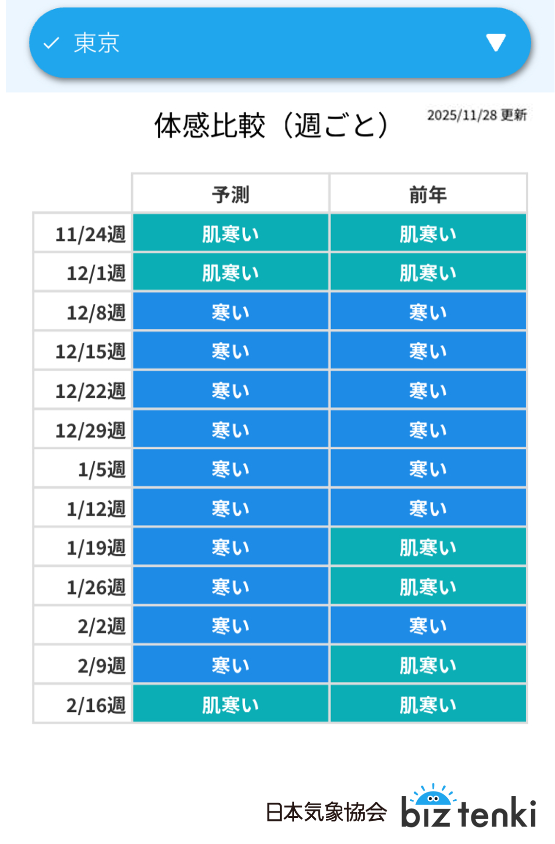 東京では12月中旬にかけて平年よりやや高い気温となりますが、寒気の影響を受けて急に冷え込む日もあるでしょう。体感は前年同様、12月から「寒い」となり、冬商材の需要が高まるでしょう。