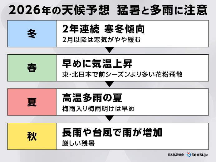 シーズンを通して厳しい寒さとなるものの、2月以降は寒気がやや緩み、春の訪れは2025年より早い可能性があります。