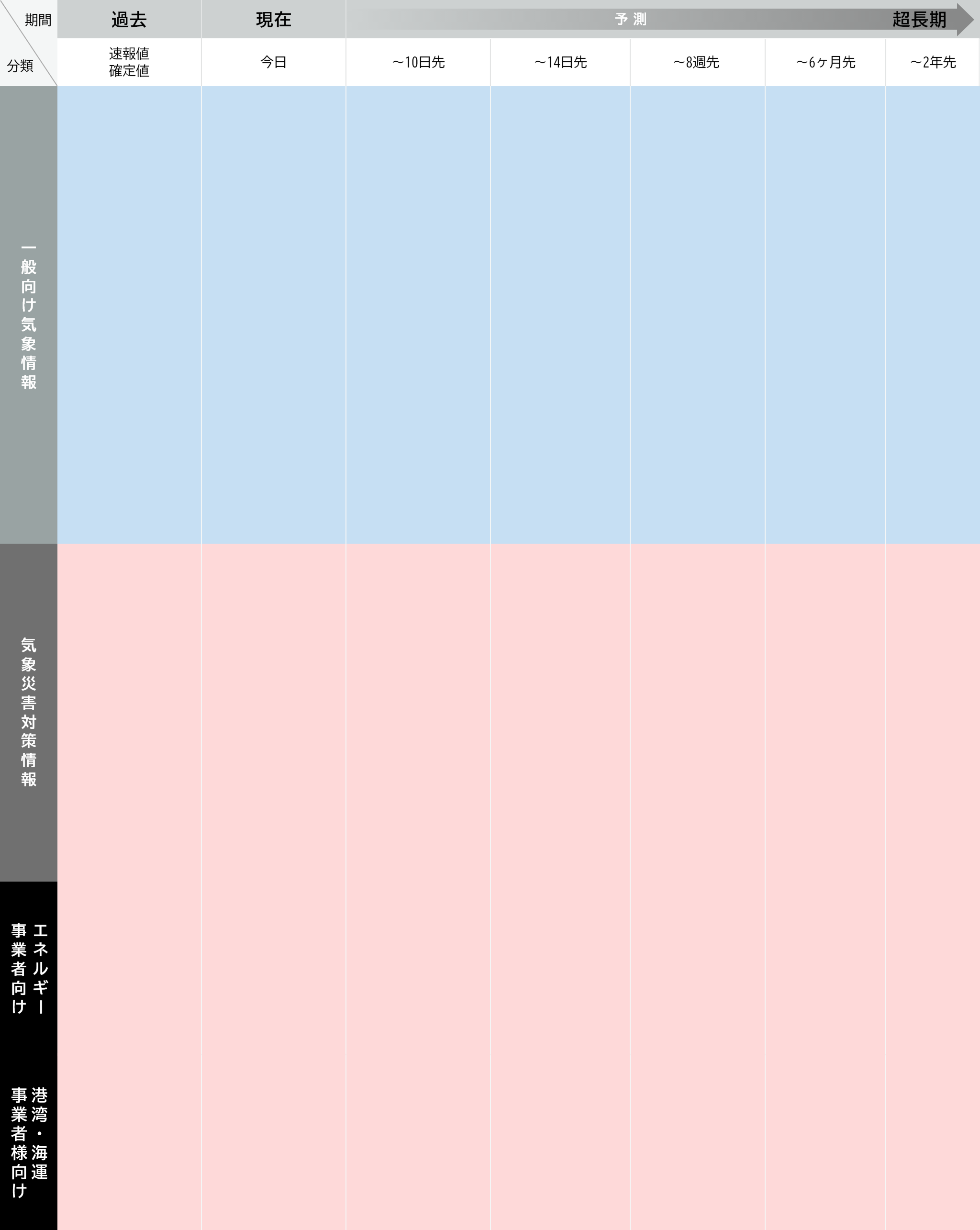 各種ビジネスの計画・予測に使用可能な、今日・明日の天気予報から、1か月先、3か月先、最長2年先まで、お客様のニーズに合わせた長期間の気象予測情報を提供します。